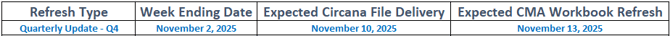 As a general guideline, CMA workbooks refresh on Wednesday nights, making the updated data available Thursday morning. Each refresh reflects the next Circana week ending date, which falls on a Sunday. As a result, there is approximately a one-to-two-week lag between the current date and the workbook's week ending date.